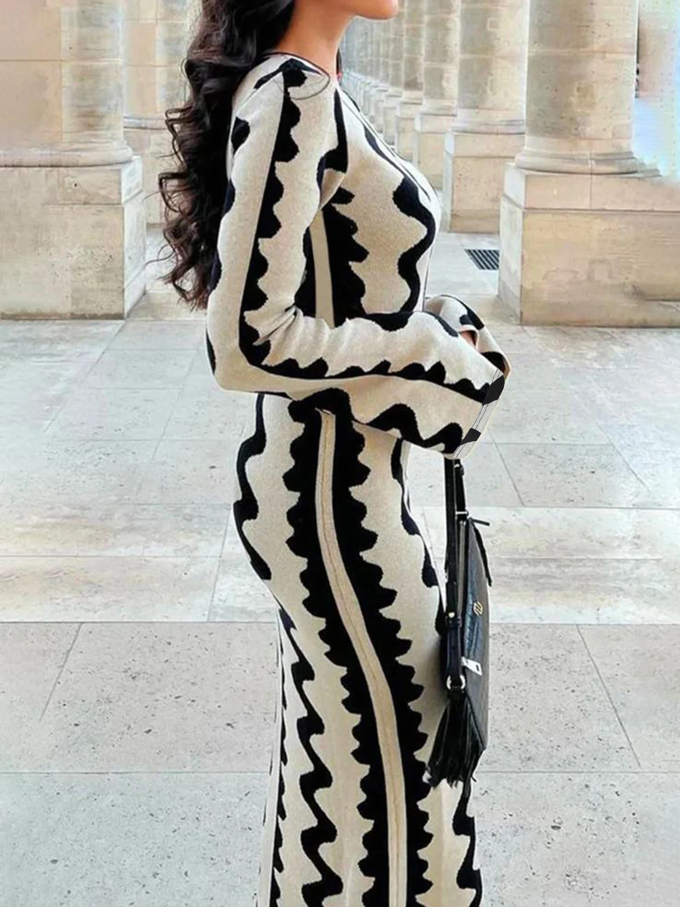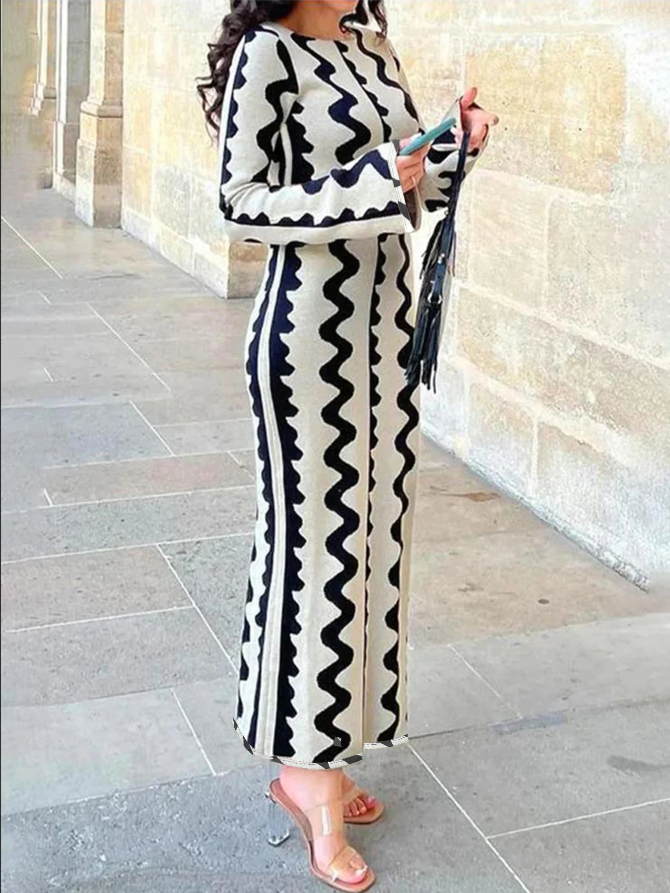 Spring and Autumn New Women's Black and Gray Wave Stripe Fashion Print Dress European and American Style Slim Elegant Long Sleeve Dress